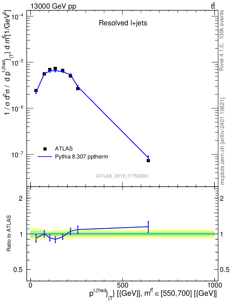 Lines: data, pythia8 8.307 pptherm |
