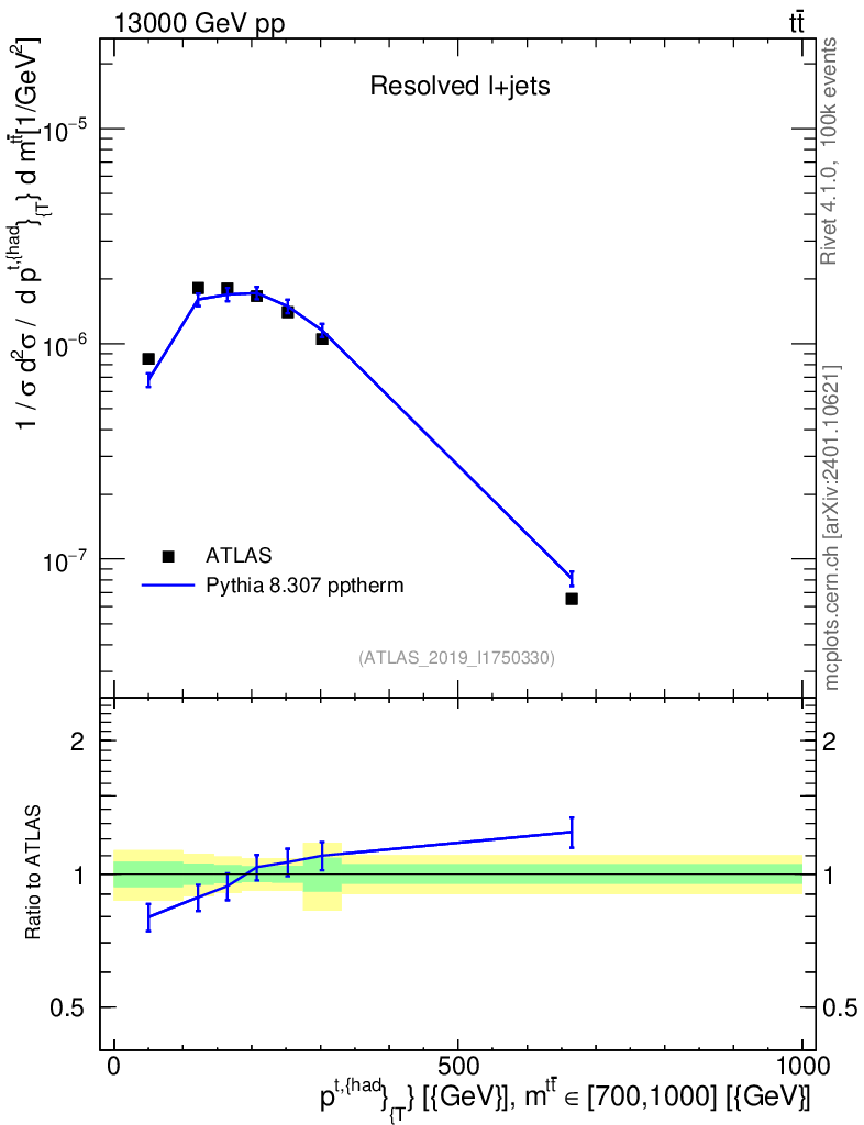 Lines: data, pythia8 8.307 pptherm |