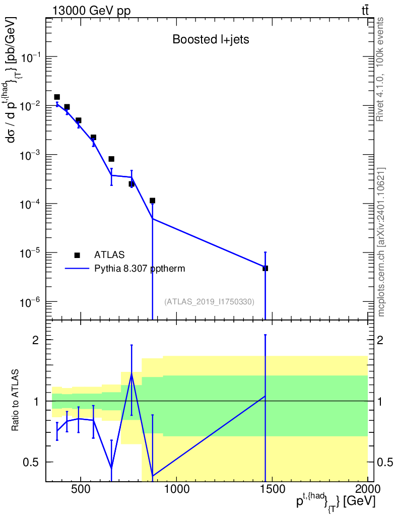 Lines: data, pythia8 8.307 pptherm |