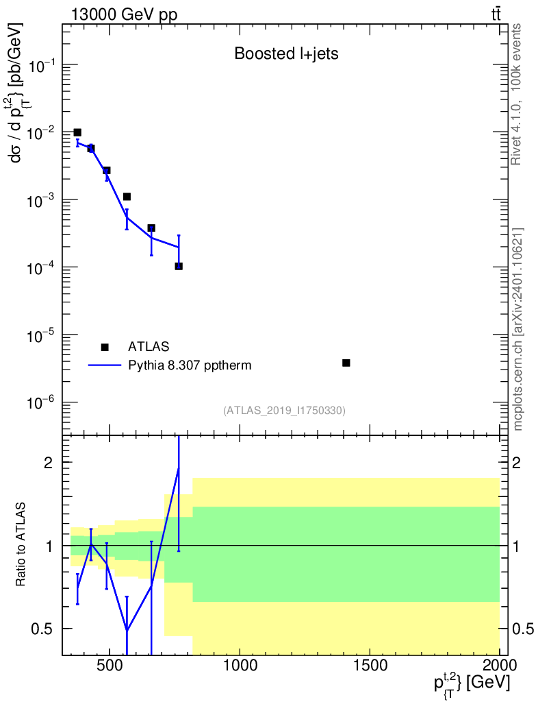 Lines: data, pythia8 8.307 pptherm |