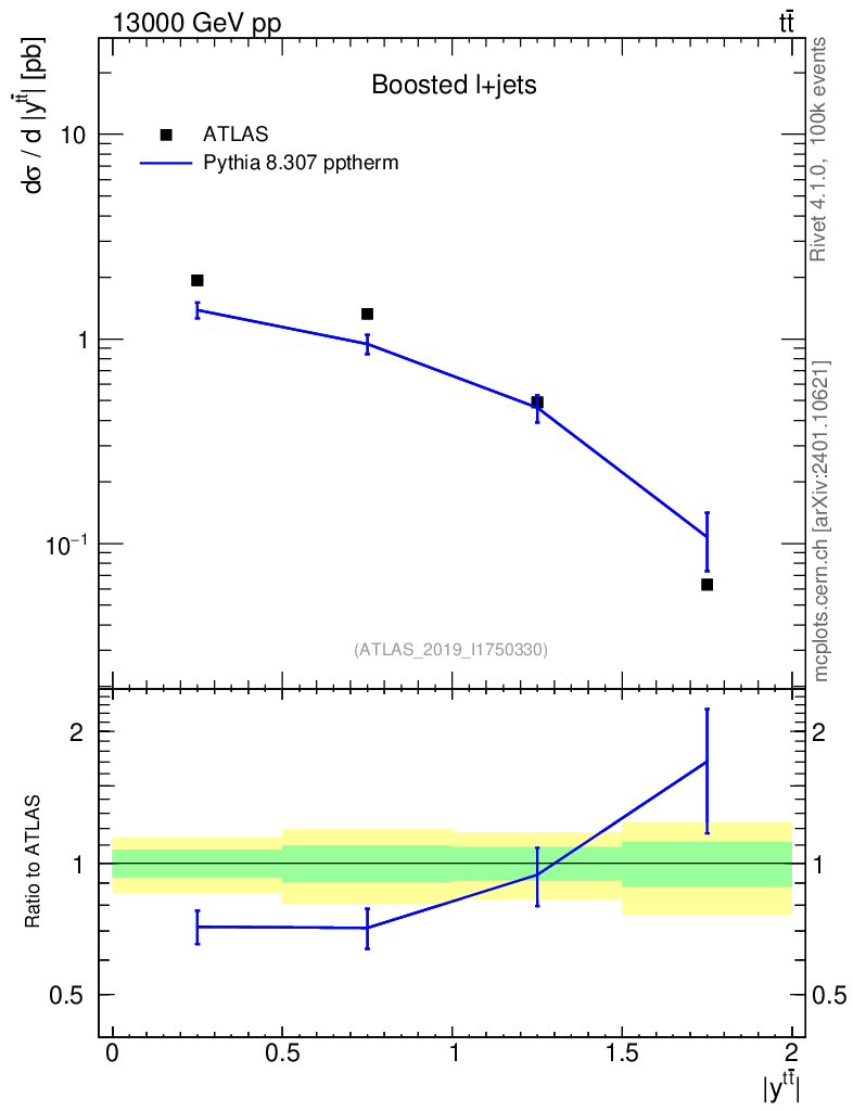 Lines: data, pythia8 8.307 pptherm |