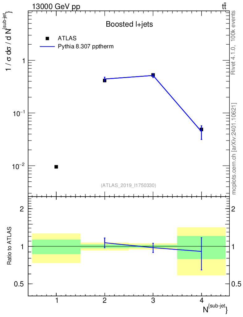Lines: data, pythia8 8.307 pptherm |