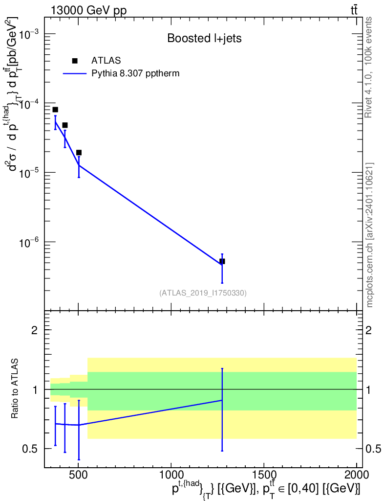 Lines: data, pythia8 8.307 pptherm |