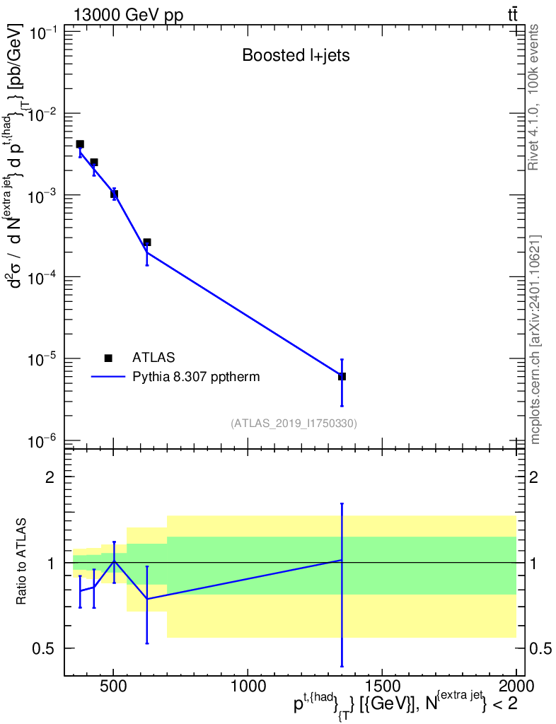 Lines: data, pythia8 8.307 pptherm |