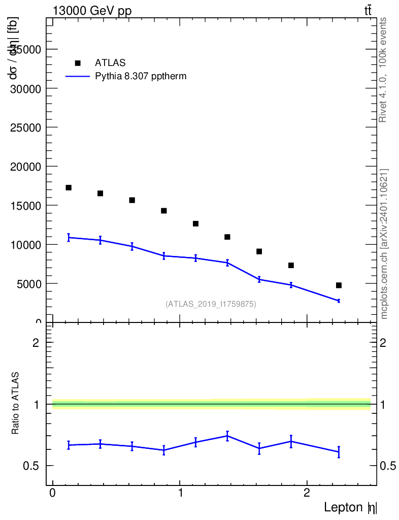 Lines: data, pythia8 8.307 pptherm |
