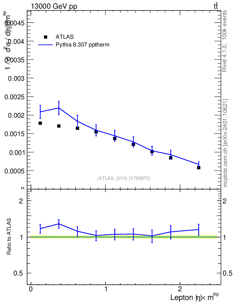 Lines: data, pythia8 8.307 pptherm |