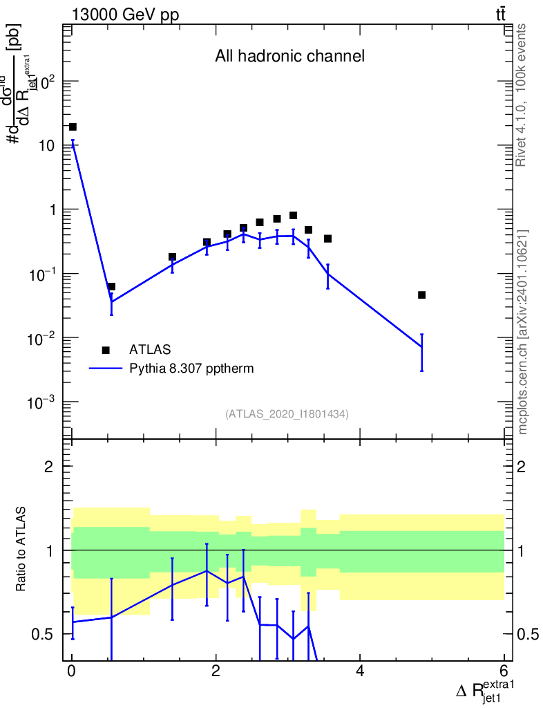 Lines: data, pythia8 8.307 pptherm |