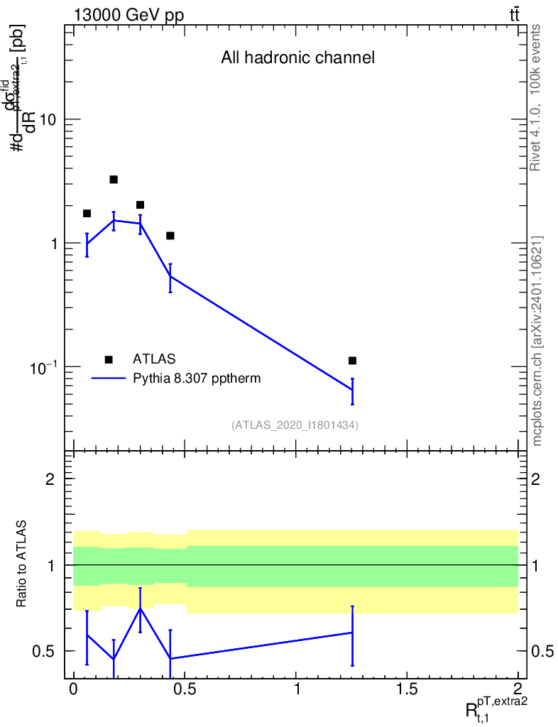 Lines: data, pythia8 8.307 pptherm |