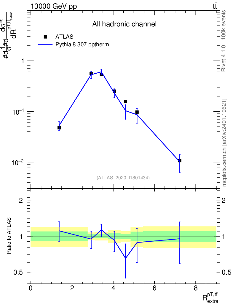 Lines: data, pythia8 8.307 pptherm |