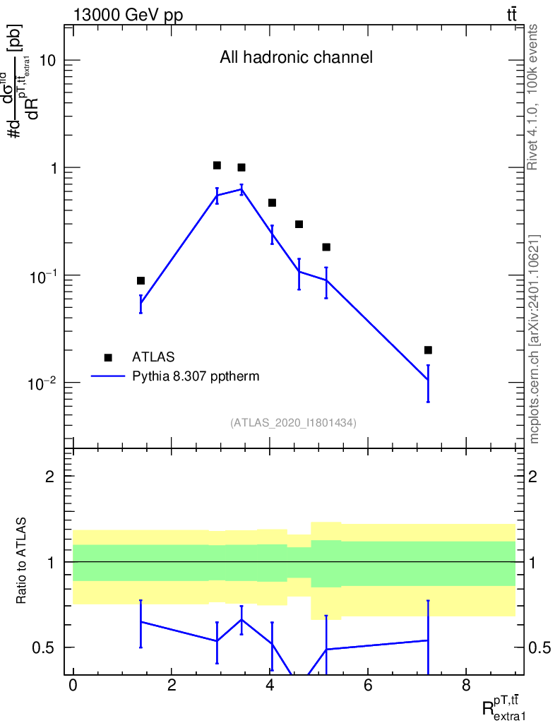 Lines: data, pythia8 8.307 pptherm |