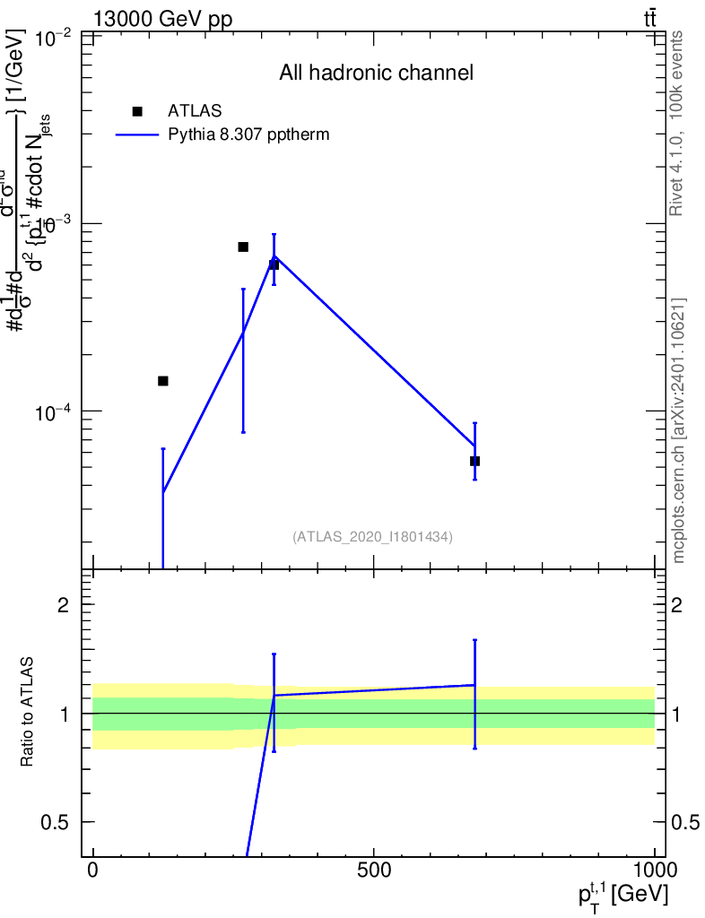 Lines: data, pythia8 8.307 pptherm |