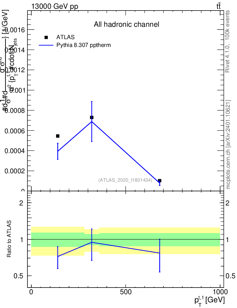 Lines: data, pythia8 8.307 pptherm |