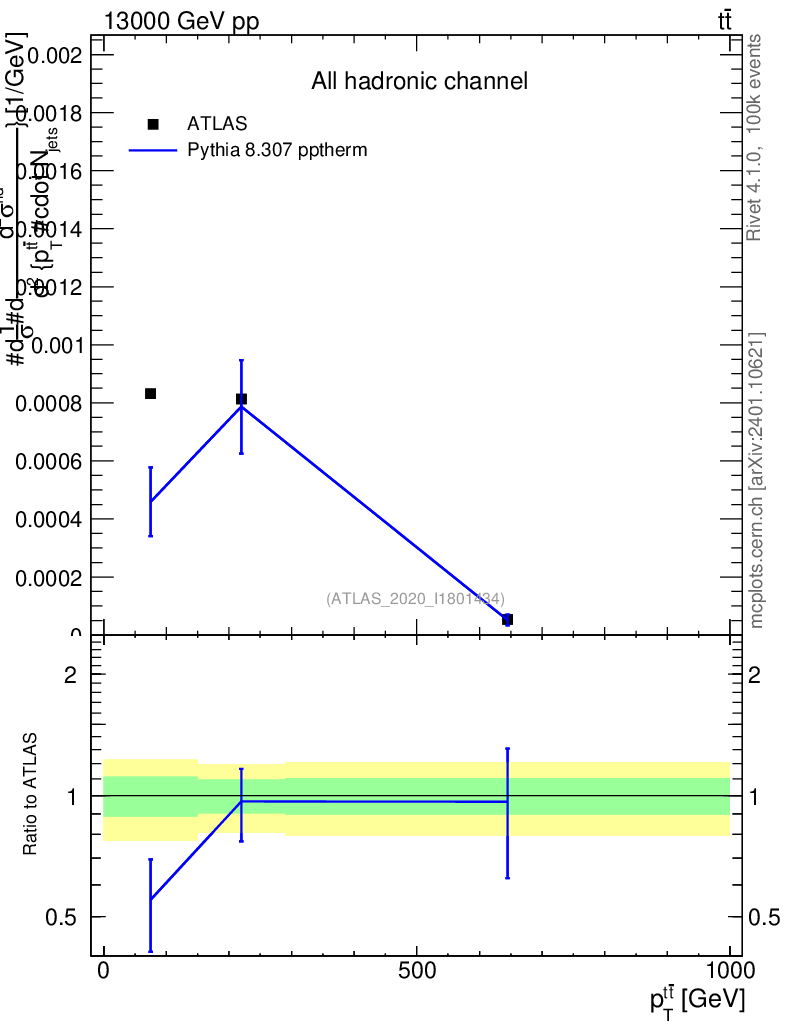 Lines: data, pythia8 8.307 pptherm |