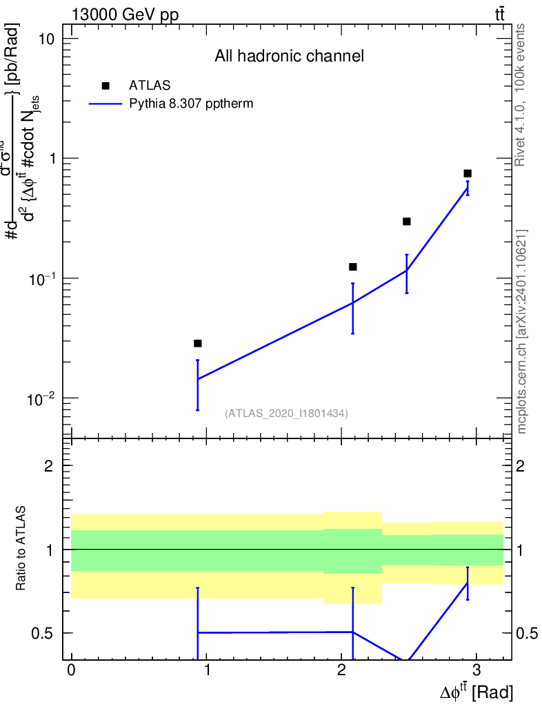 Lines: data, pythia8 8.307 pptherm |