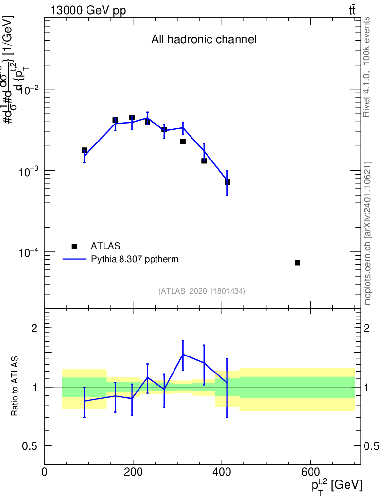 Lines: data, pythia8 8.307 pptherm |