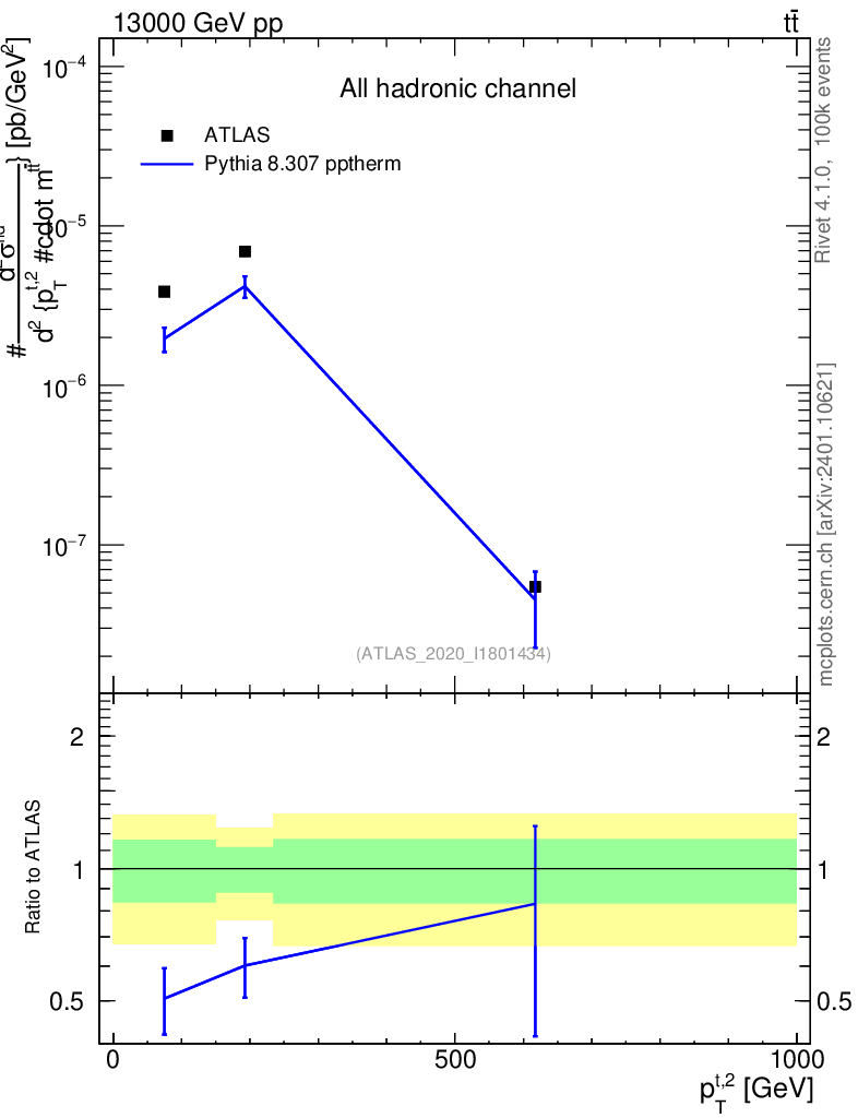 Lines: data, pythia8 8.307 pptherm |