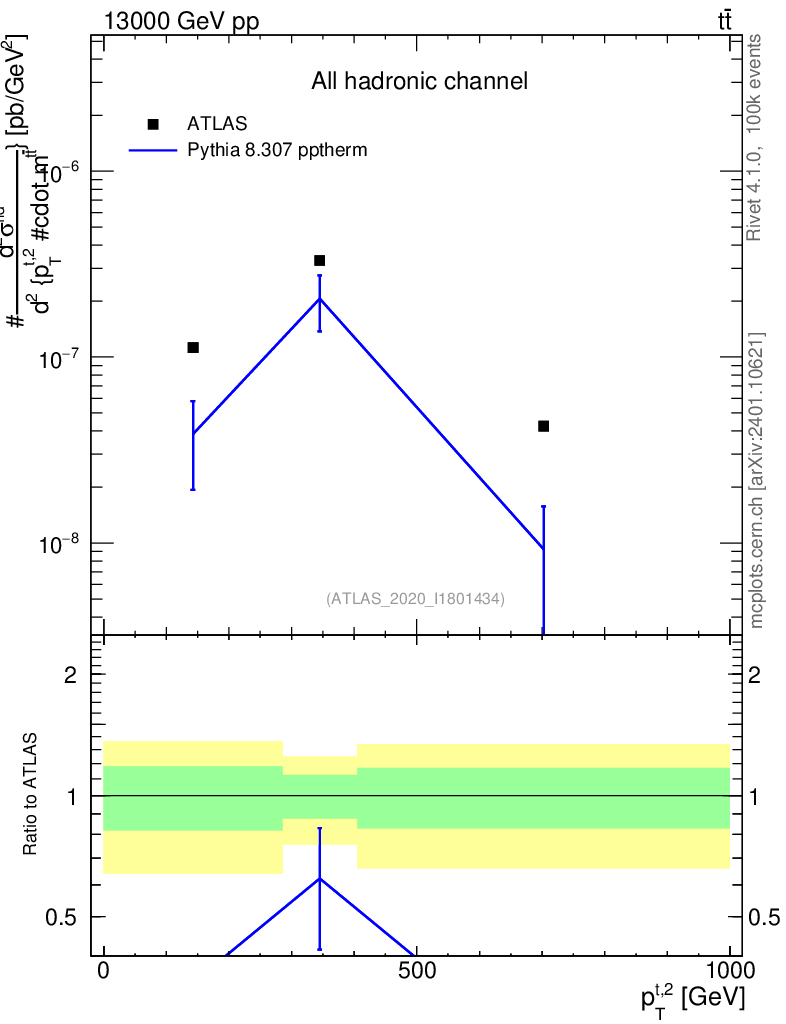 Lines: data, pythia8 8.307 pptherm |