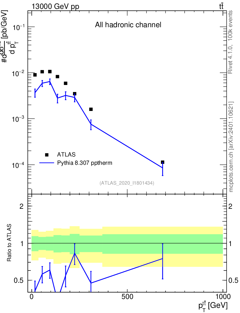 Lines: data, pythia8 8.307 pptherm |