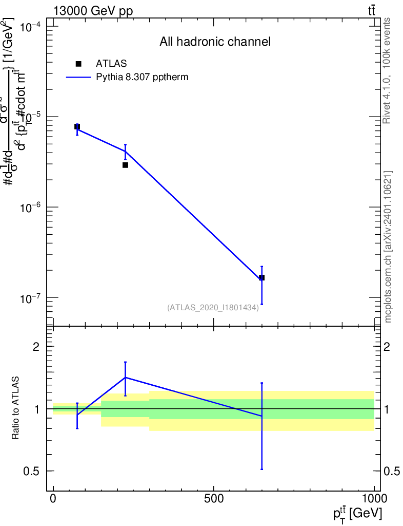 Lines: data, pythia8 8.307 pptherm |