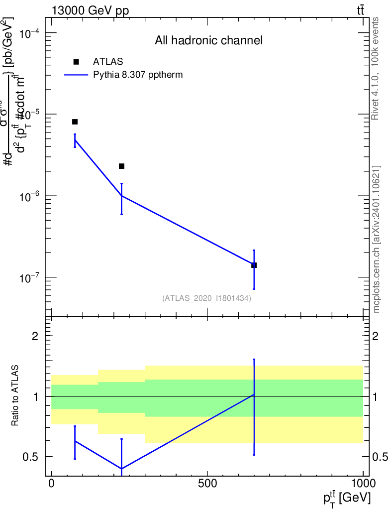 Lines: data, pythia8 8.307 pptherm |