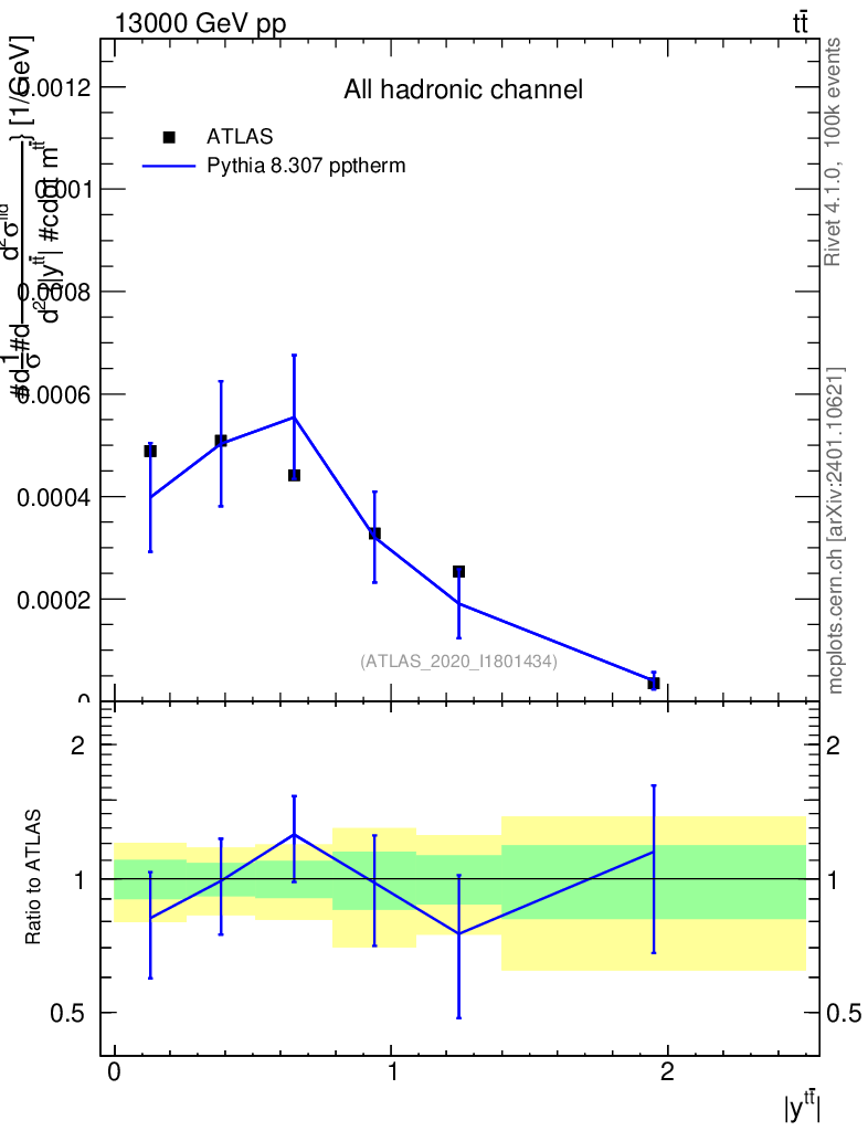 Lines: data, pythia8 8.307 pptherm |