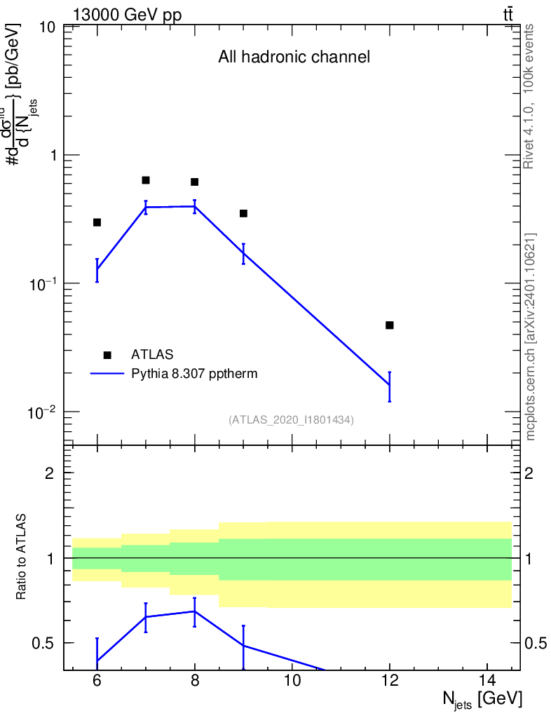 Lines: data, pythia8 8.307 pptherm |
