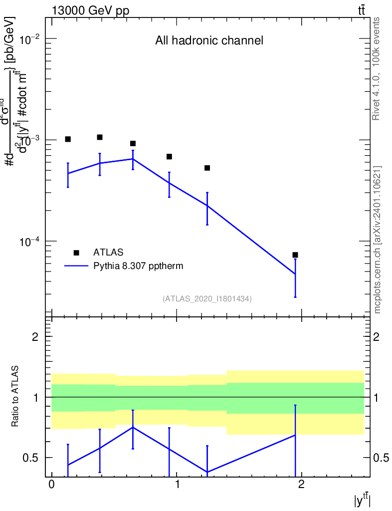 Lines: data, pythia8 8.307 pptherm |