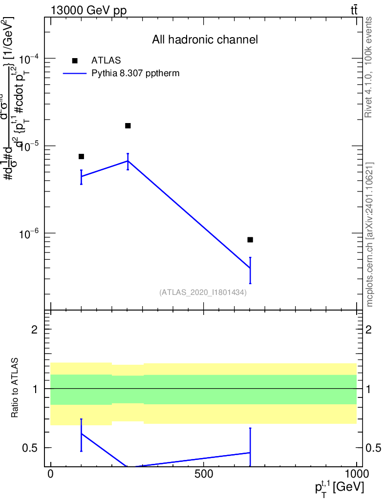 Lines: data, pythia8 8.307 pptherm |