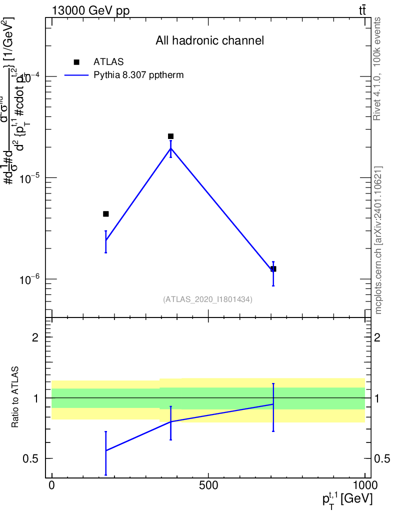 Lines: data, pythia8 8.307 pptherm |
