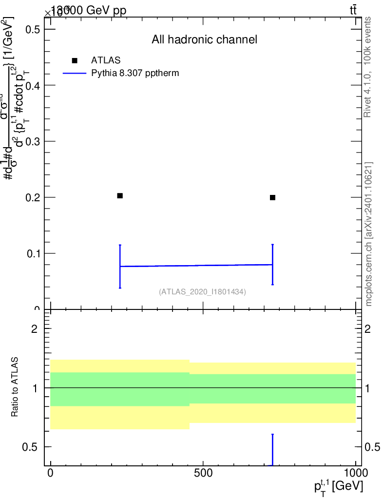 Lines: data, pythia8 8.307 pptherm |