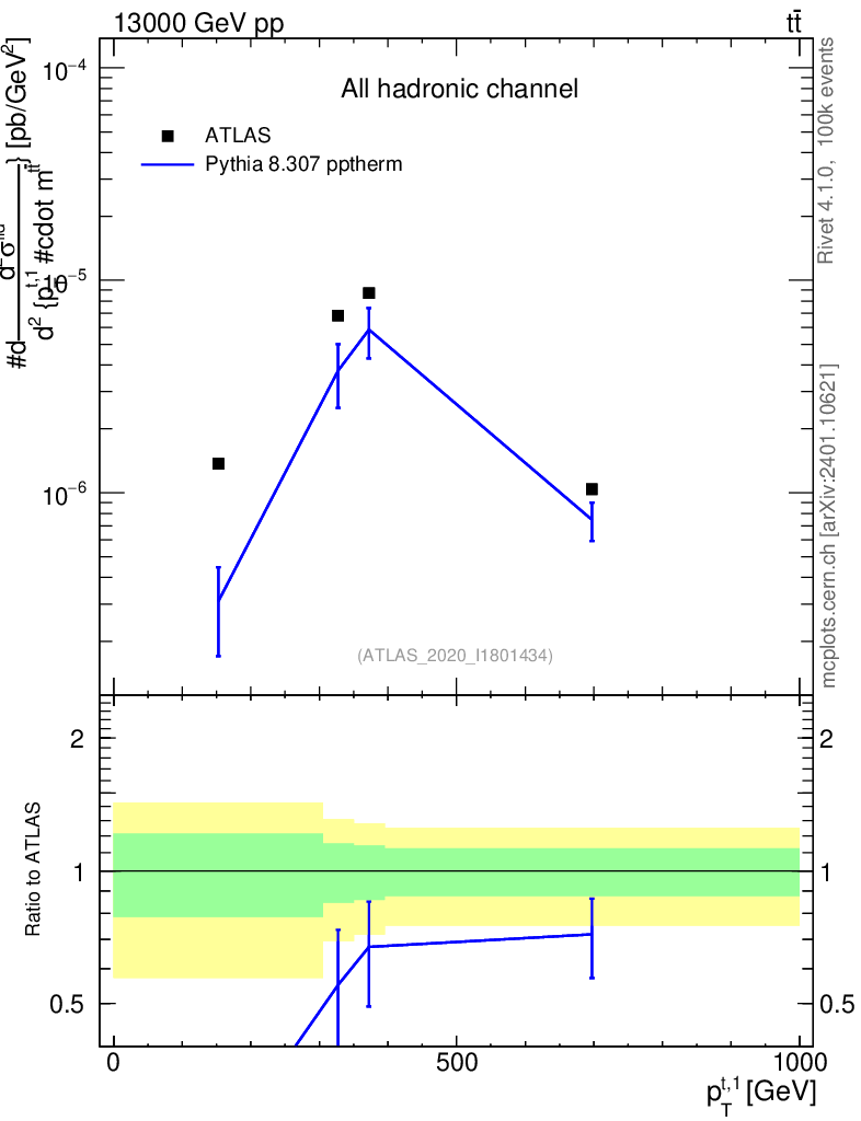 Lines: data, pythia8 8.307 pptherm |