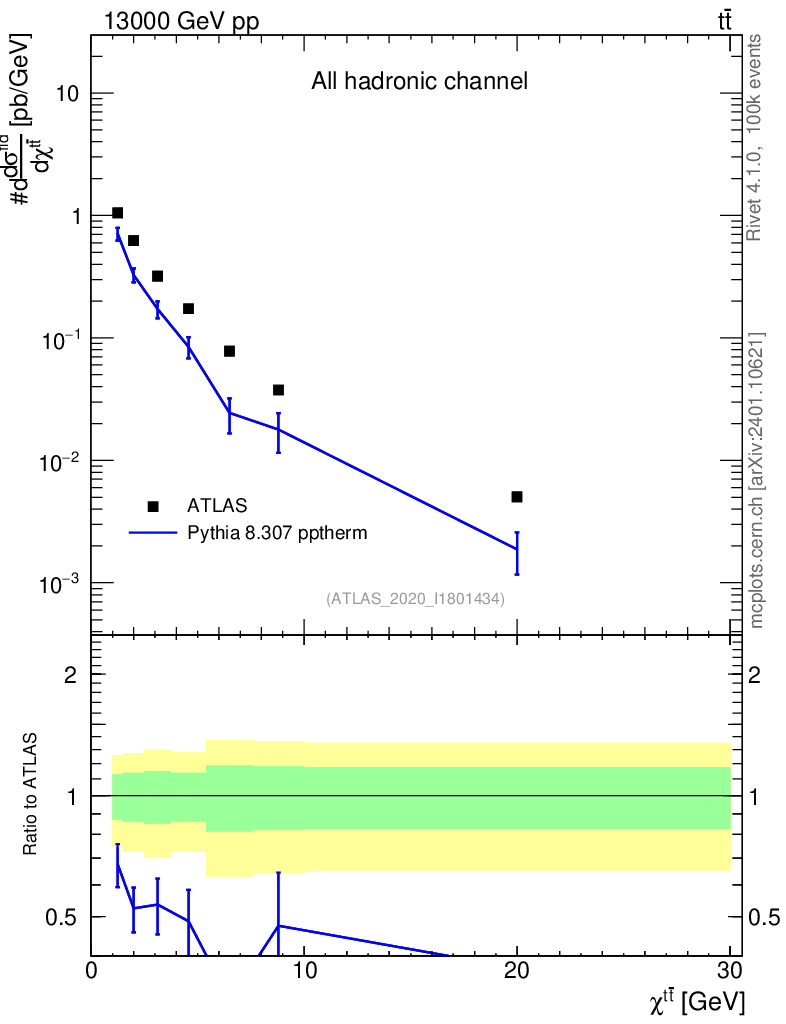 Lines: data, pythia8 8.307 pptherm |