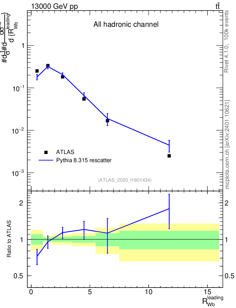 Lines: data, pythia8 8.315 rescatter |