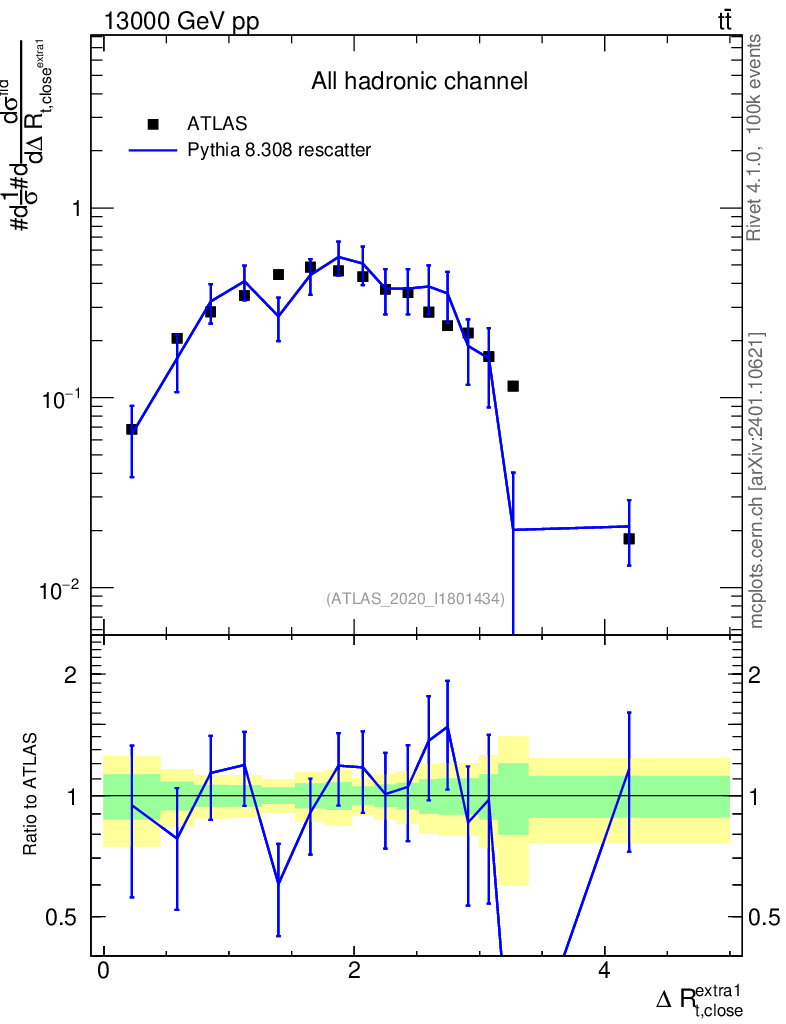 Lines: data, pythia8 8.308 rescatter |