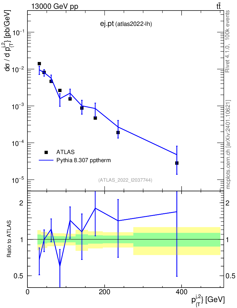 Lines: data, pythia8 8.307 pptherm |