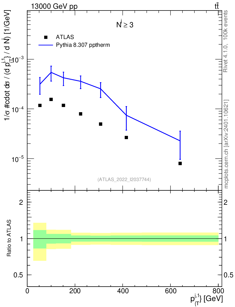 Lines: data, pythia8 8.307 pptherm |