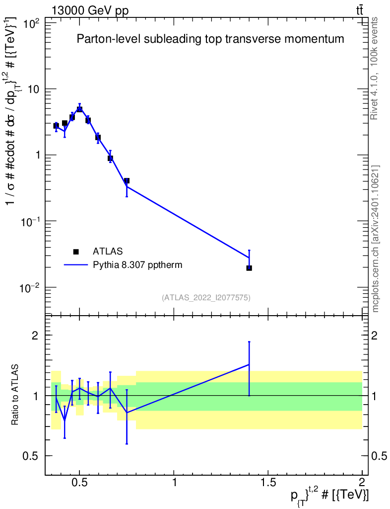 Lines: data, pythia8 8.307 pptherm |