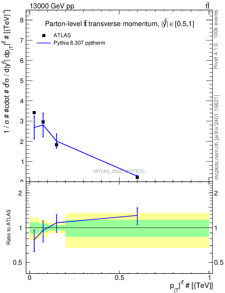 Lines: data, pythia8 8.307 pptherm |