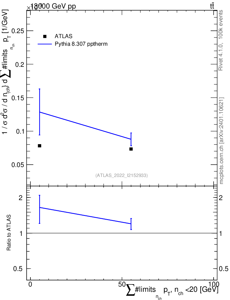 Lines: data, pythia8 8.307 pptherm |