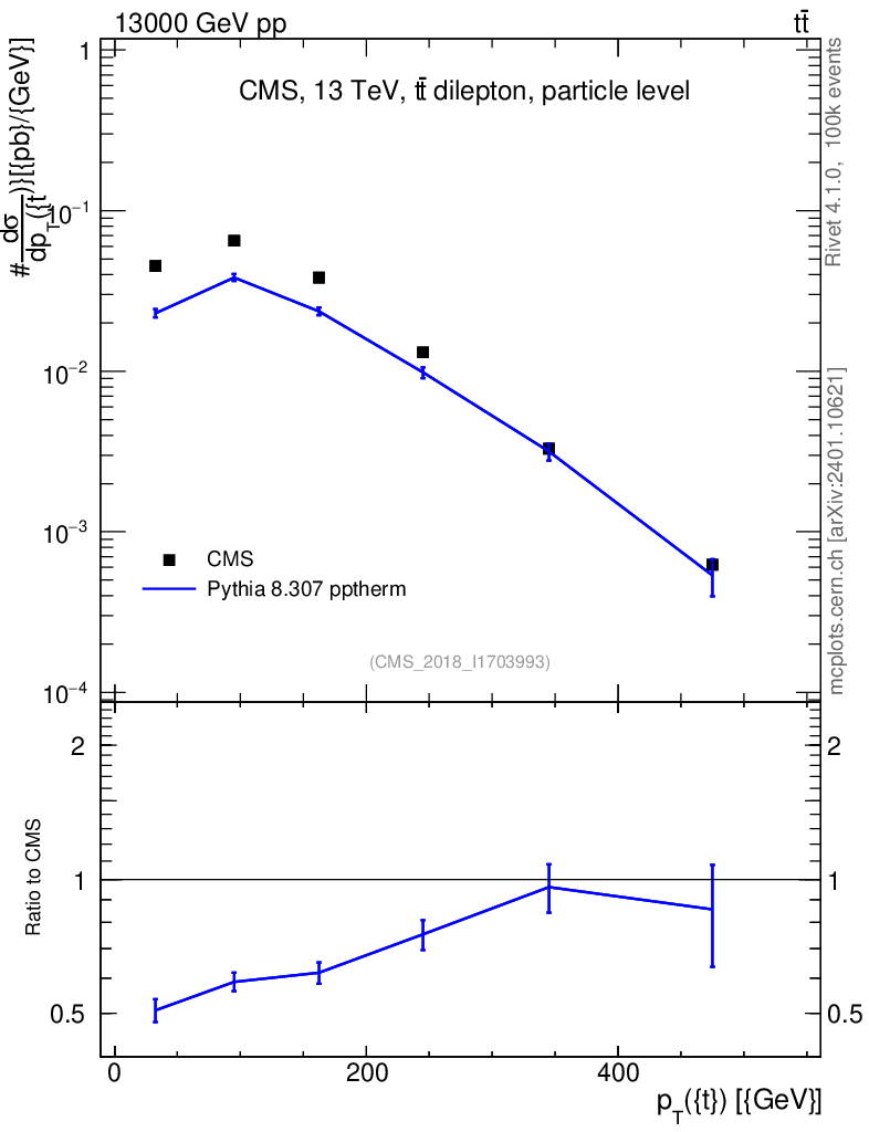 Lines: data, pythia8 8.307 pptherm |
