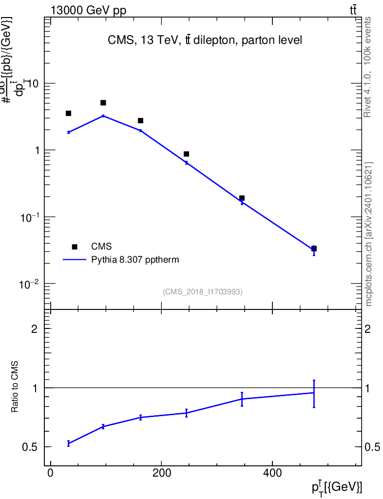 Lines: data, pythia8 8.307 pptherm |