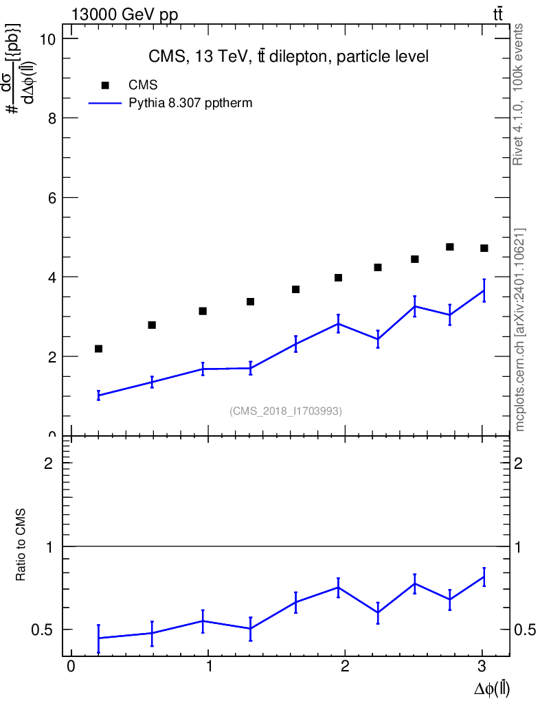 Lines: data, pythia8 8.307 pptherm |