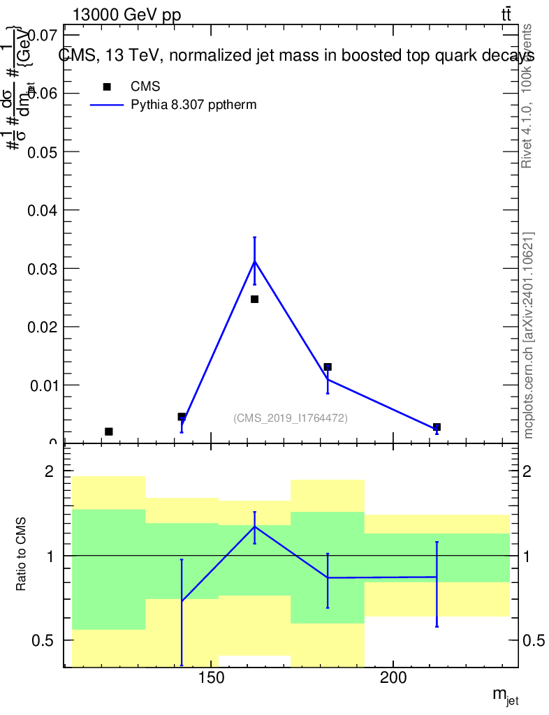 Lines: data, pythia8 8.307 pptherm |