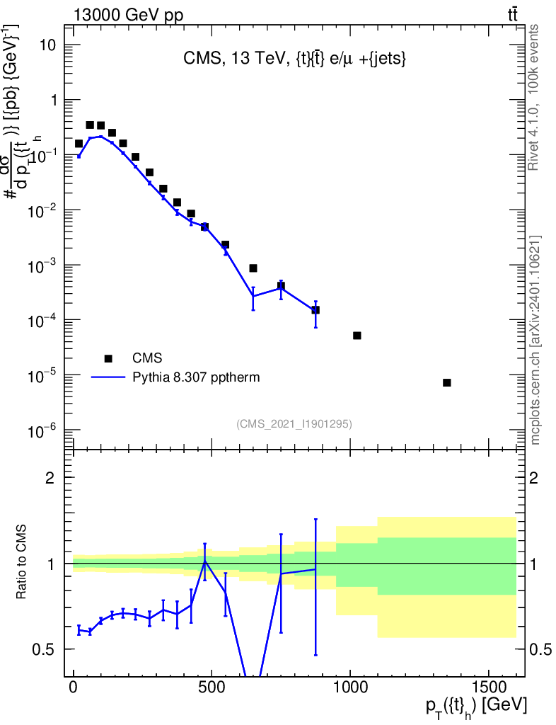 Lines: data, pythia8 8.307 pptherm |