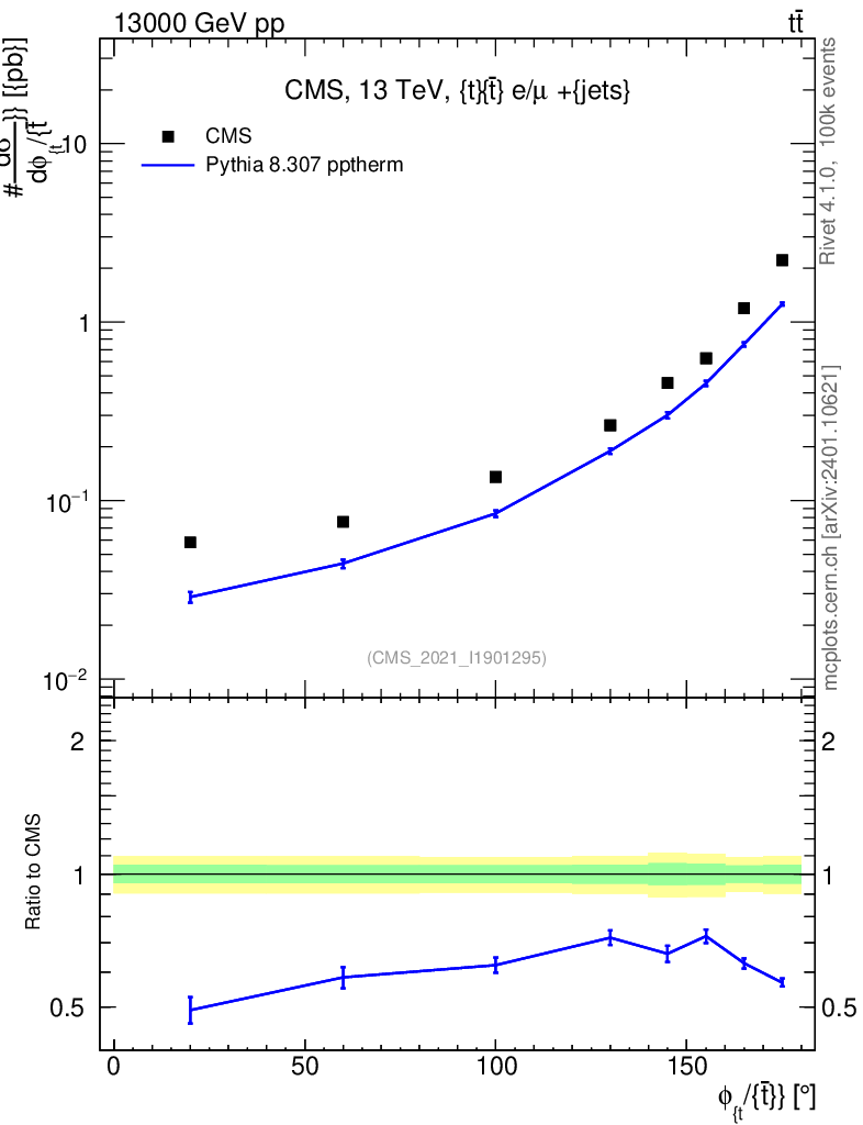 Lines: data, pythia8 8.307 pptherm |