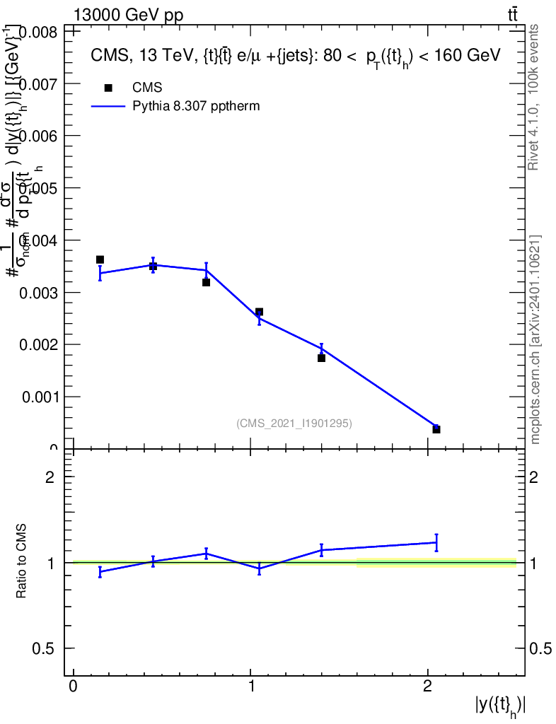 Lines: data, pythia8 8.307 pptherm |