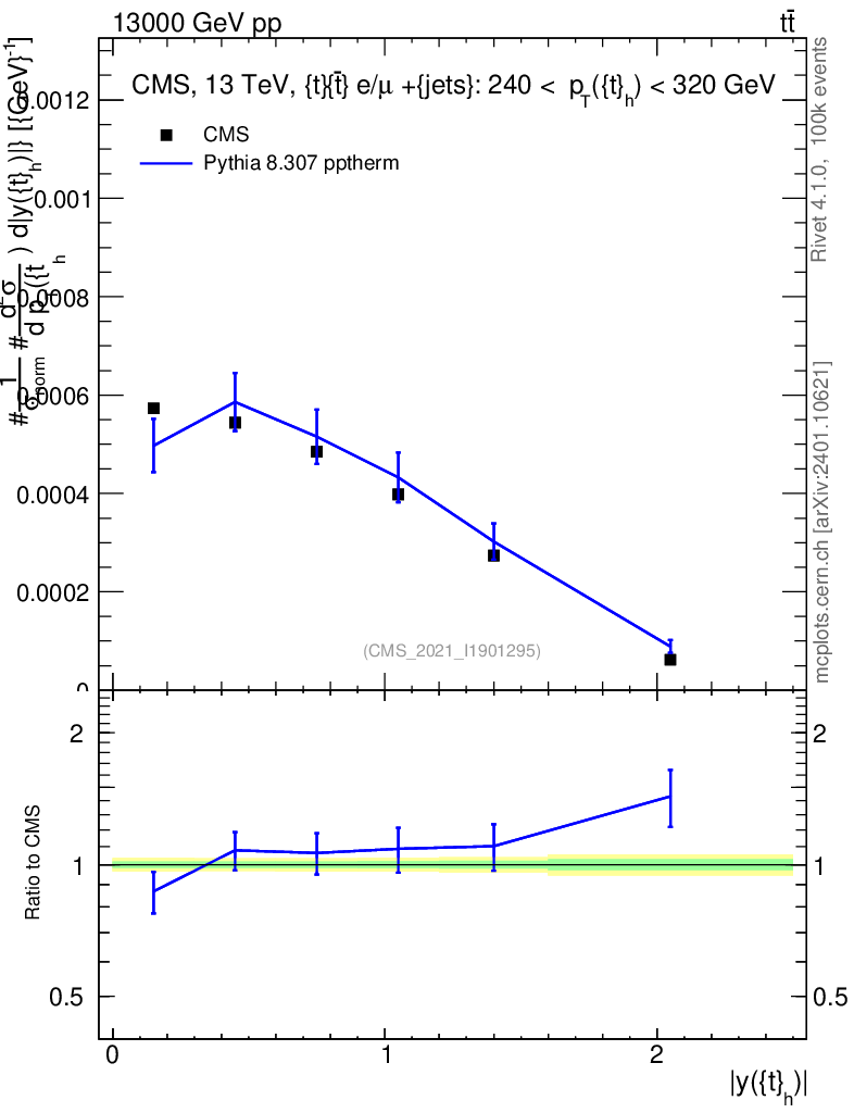 Lines: data, pythia8 8.307 pptherm |