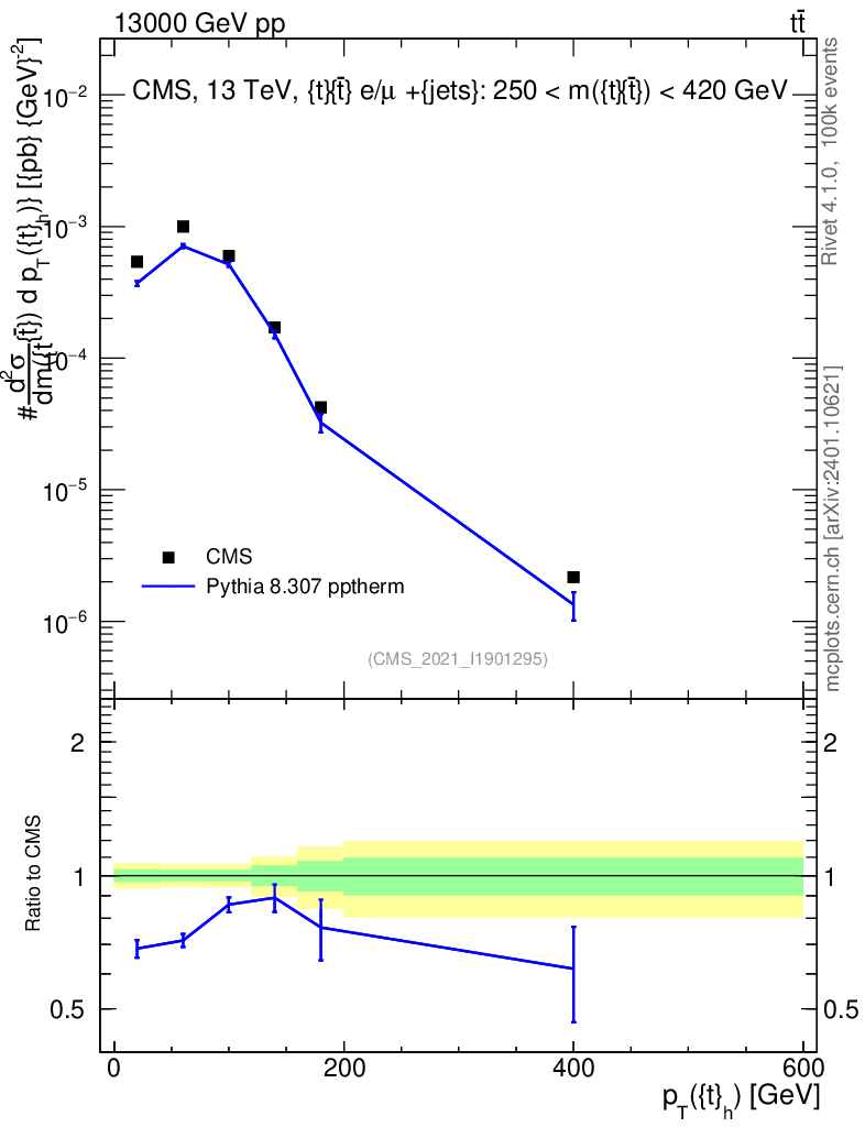 Lines: data, pythia8 8.307 pptherm |