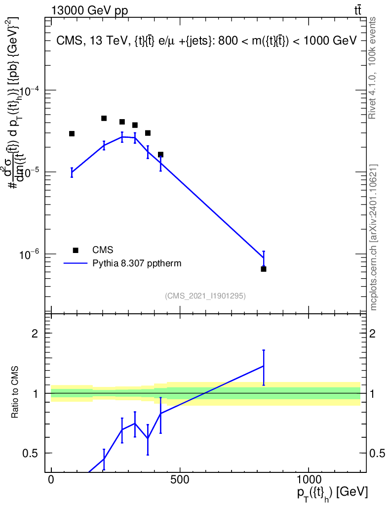 Lines: data, pythia8 8.307 pptherm |