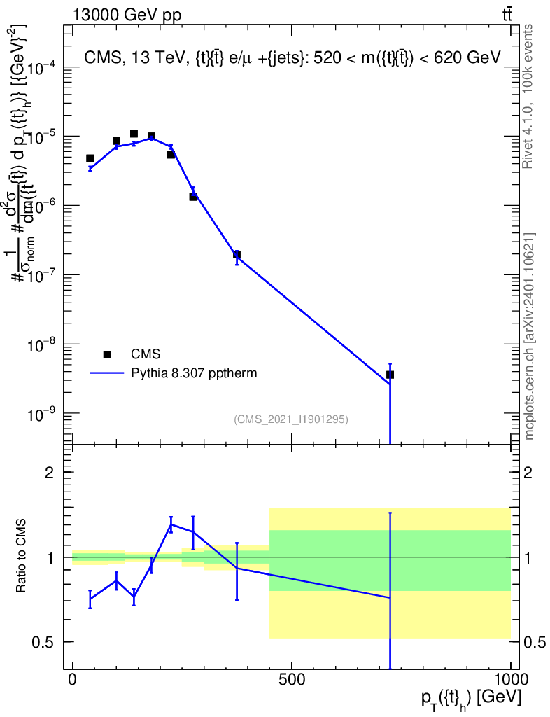 Lines: data, pythia8 8.307 pptherm |